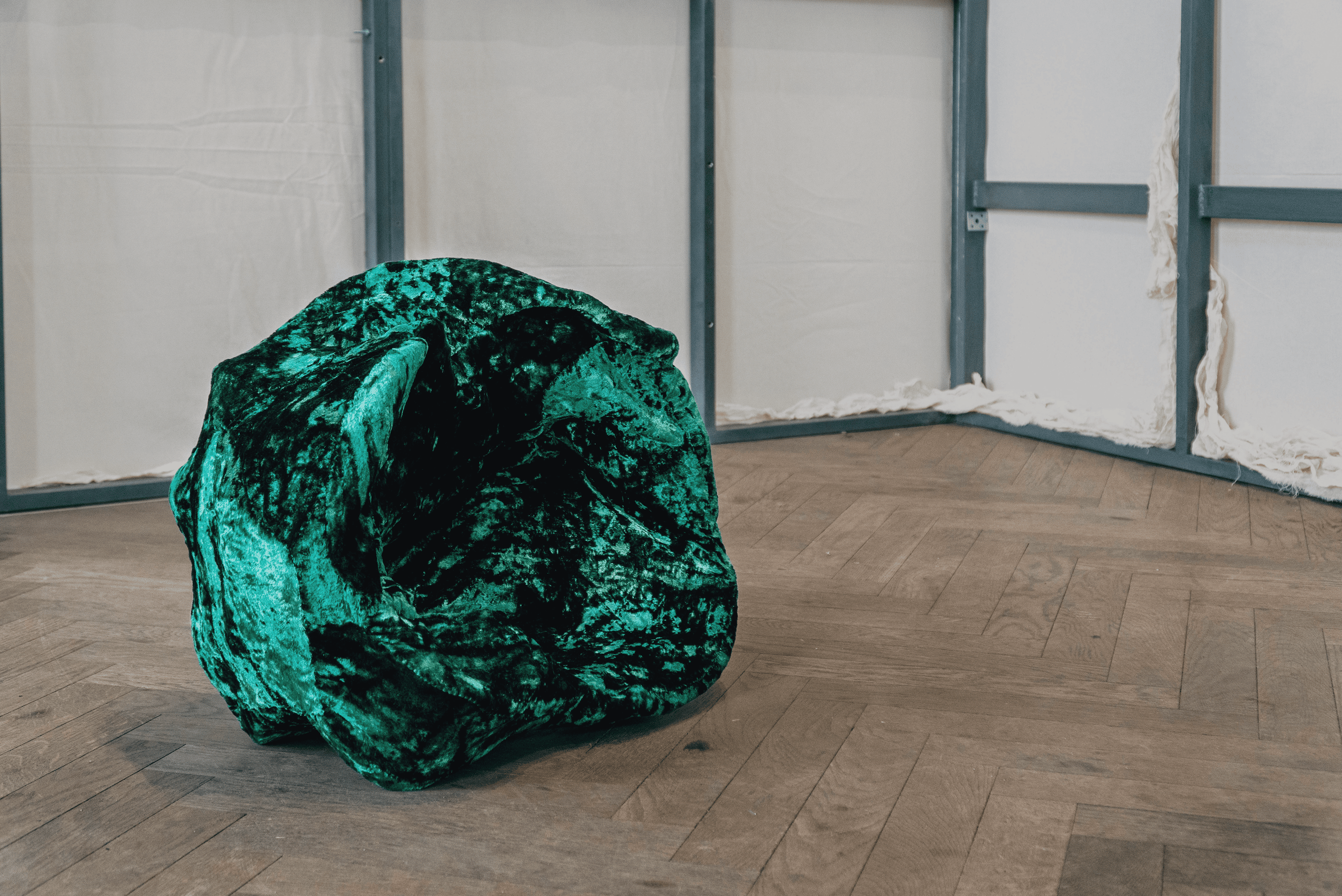 По своей форме объект отсылает к необработанному малахитовому камню, но из-за материальности иного рода — мягкой, текстильной — ассоциируется он скорее с телесными переживаниями. Этот полый камень, своего рода детское место, — попытка сконструировать пространство, из которого могла появиться та самая девочка, носившая платье из медных колечек.